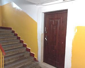 drzwi płycinowe pełne z panelowym wzorem, ściany pomalowane farbą emulsyjną w kolorze szarym, podłoga wyłożona glazurą (płytki PCV) w kolorze beżowym, w zastępstwie listew