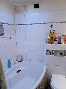 pomieszczenie otwarte – brak drzwi wejściowych – łazienki – po remoncie w pełni wyposażona (wanna, umywalka z szafką, wc,), na podłodze i ścianach do wysokości ok. 2 m glazura (płytki